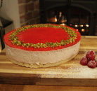 A delicate vanilla sponge base layered with sweet raspberry bavarois and a raspberry filling, topped with a vibrant raspberry glaze and finished with a border of crushed pistachios. Suitable for vegans.