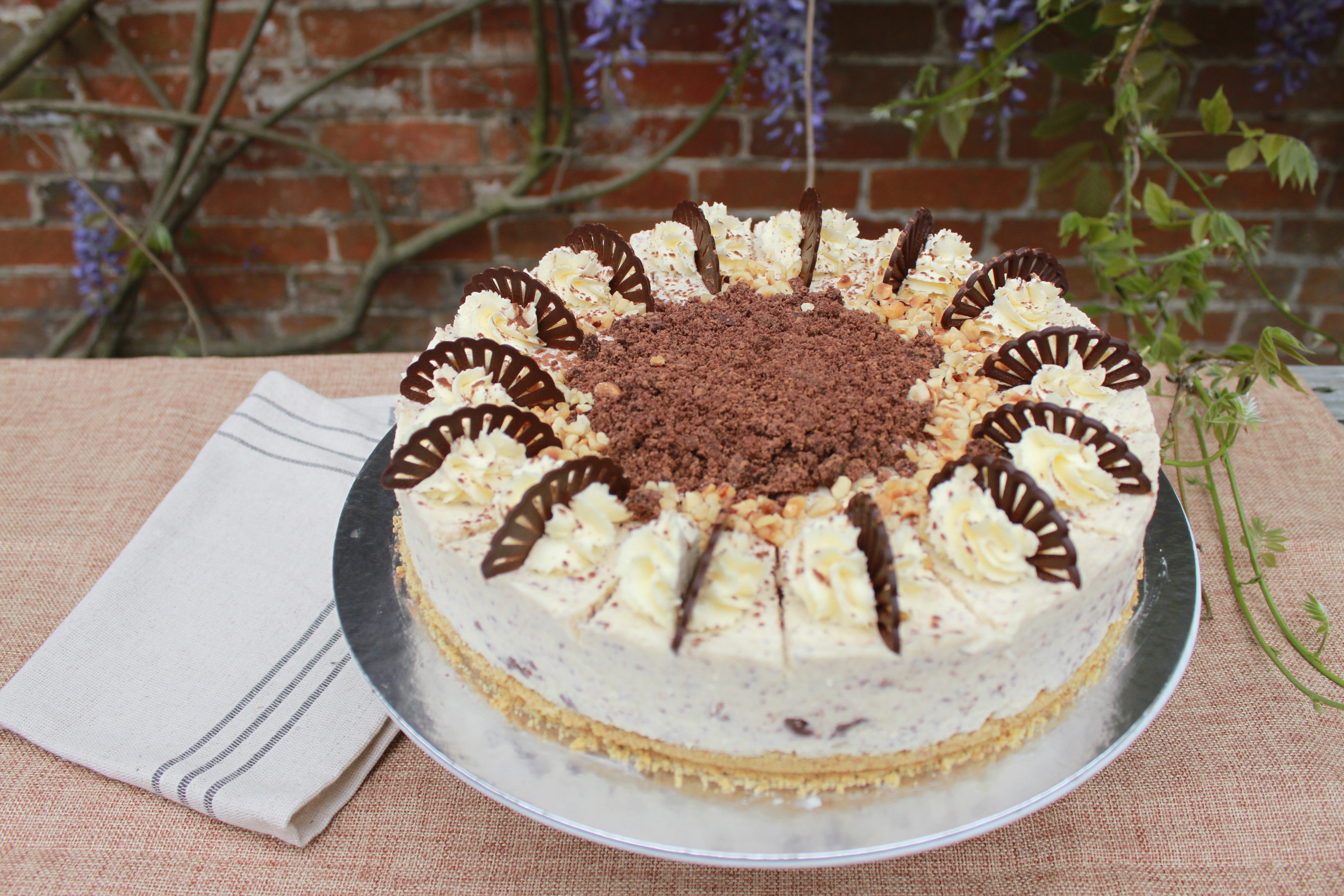 A rich and creamy vanilla cheesecake mixed with chocolate & hazelnut shortbread biscuits, topped with rosette of cream, chocolate decoration & hazelnut nibs.