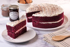 Our Red Velvet Cake boasts a distinctive red sponge, layered and topped with velvety cream cheese frosting and a layer of Tiptree Strawberry Jam for a fruity twist. Finished with a dusting of cocoa, it's a rich and indulgent treat with a touch of elegance.