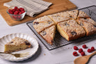 Indulge in our Vegan Raspberry Crumble, made with a sweet vegan pastry base, layered with tangy raspberry jam and light vanilla sponge, and finished with a golden crumble topping and a dusting of sugar. Perfectly paired with custard for a comforting dessert!
