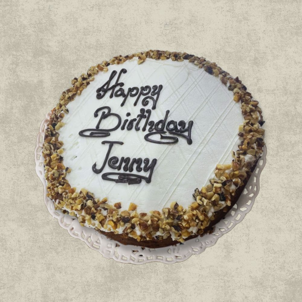 Baked fresh in our Tiptree Patisserie, you can choose from three classic flavours: rich Chocolate, moist Carrot, or light and airy Victoria Sponge. Each cake is carefully decorated and features a hand-piped personalised message, making it a truly special treat. Decorations are also available, subject to availability. Our cakes have a five-day shelf life from the day of collection and are best stored at ambient temperature.